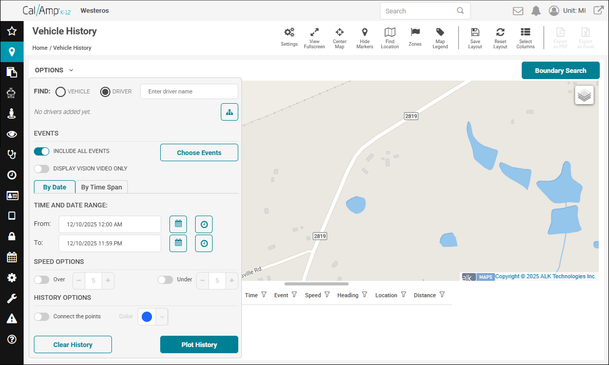 For multiple vehicles, CalAmp K-12 will choose the colors. - Click Plot History.