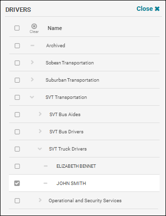 , expand the employee department the driver(s) is in, and click their check box to select them, or map the entire department's history by selecting its check box. Then click Close to exit the Drivers tree.