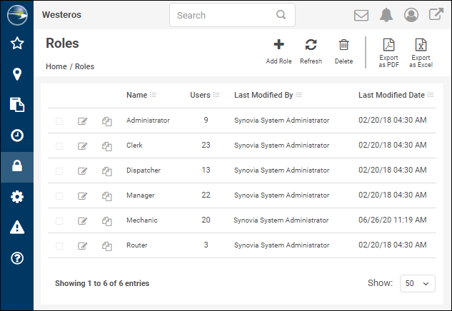 Note: Synovia is shipped with the default roles shown in the preceding figure. - Users: The number of users in your organization assigned to the role.