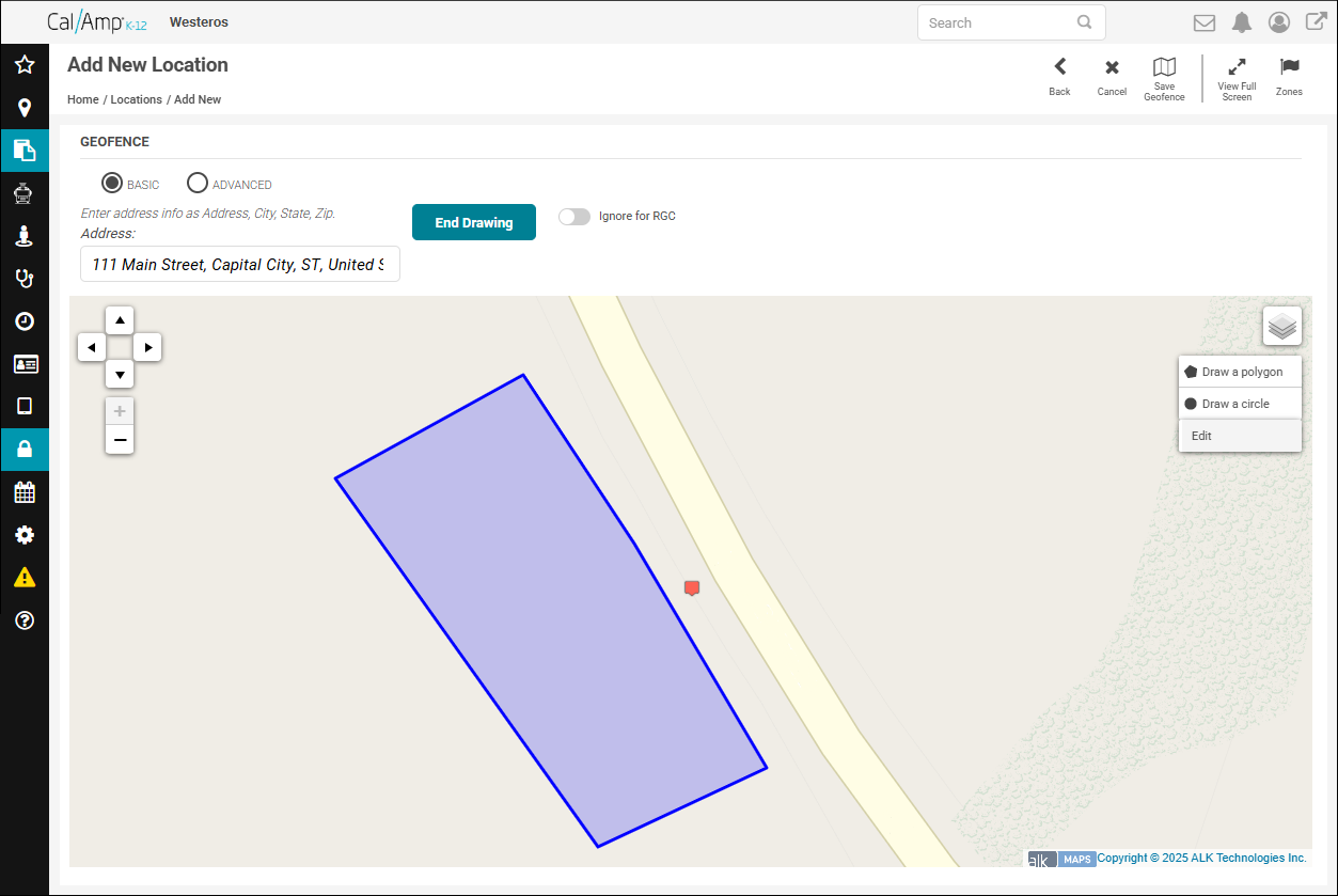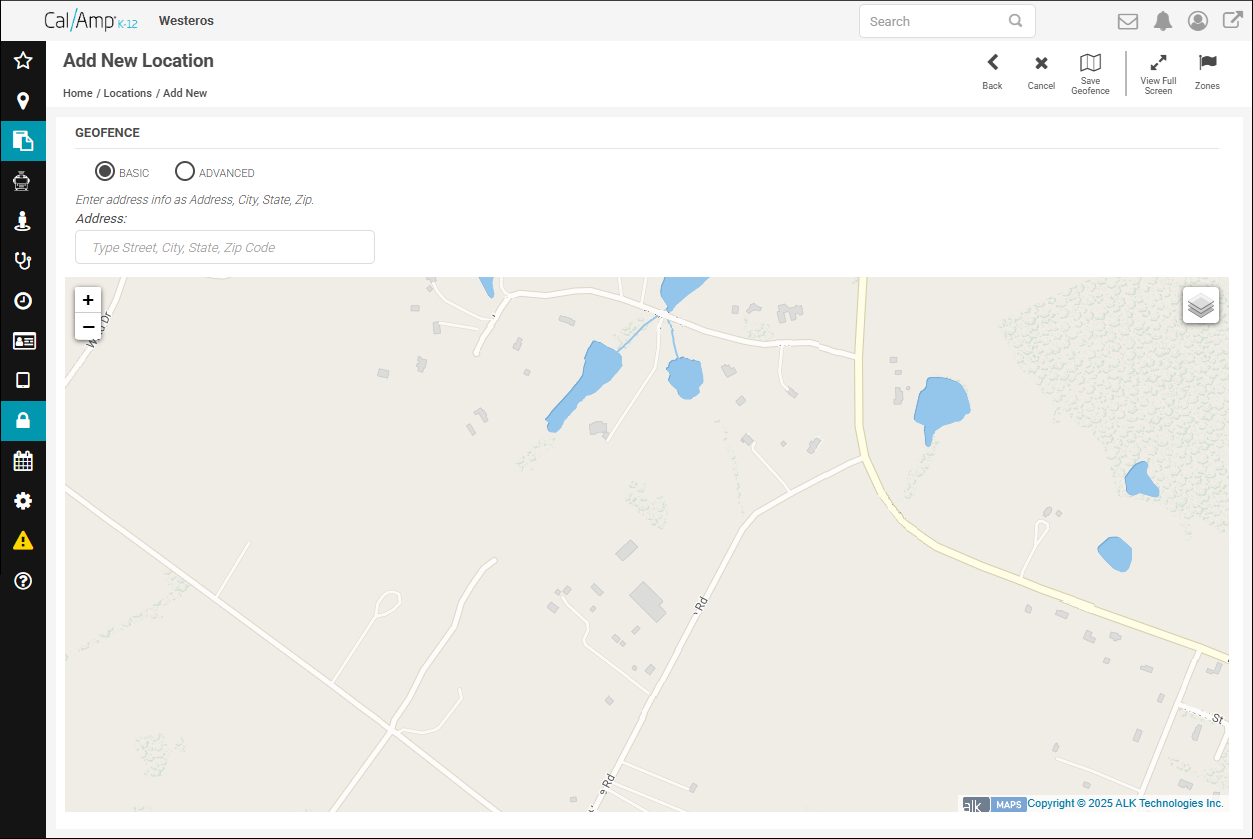 A location in CalAmp K-12 is a meaningful area in your organization, around which you draw a zone (the geofence boundary). For more details about the three types of locations (schools, yards, and landmarks), see Navigating the Locations Screen.