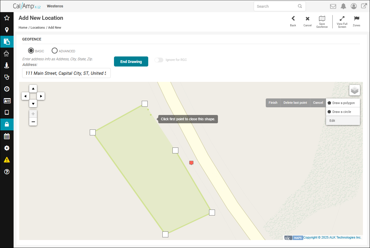Note: If you need events in the zone to be returned with specific addresses rather than with the location's name, click Ignore for RGC (which stands for reverse geocoding). - When you are finished drawing the zone, click