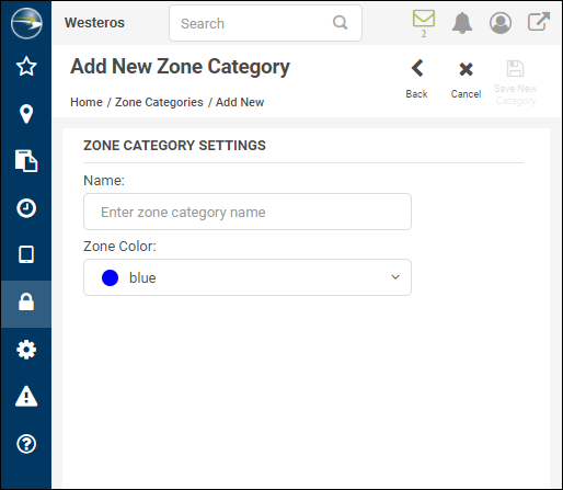 Zone categories are a way to organize the locations in your organization, to group them by type, such as all your job sites or all your schools. You can use categories to view just one type of location on the map, such as all your yards, and they enable you to limit the users who can see the locations. Only users who are assigned to a zone category can see the zones in it.