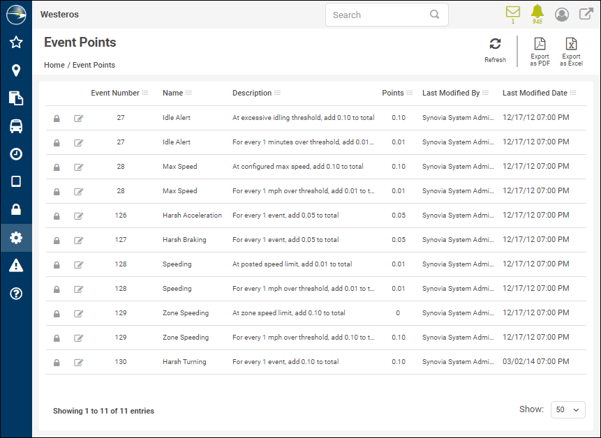 Disabled events will have a value of 0 in the Points column, such as the first Zone Speeding event in the preceding figure.