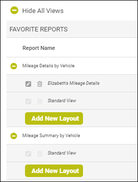 , each report in the list will expand to show its available layouts (the Standard view, which is the default display for that report, and any customized layouts you've created for it), as well as the Add New Layout button. When the views are displayed, "Show All Views" is changed to "Hide All Views," and