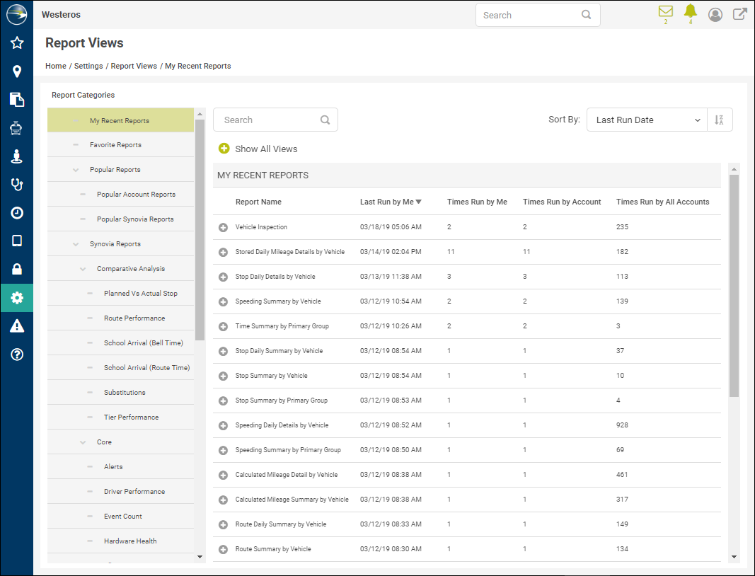 - Find the report with the custom view you want to delete, either by selecting one of the categories on the left and scrolling to it or by using the search feature on the right. (See Searching and Sorting the Reports, but perform the steps on the Report Views screen instead of Reports.)