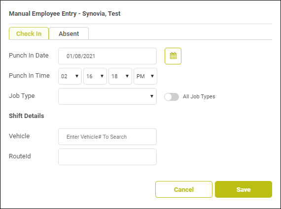 deselected.) - If you know what vehicle the employee is driving, type its number (or part of it) in the Vehicle field and select it from the drop-down list that appears.
