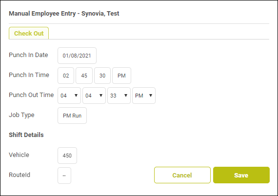 If you need the clock-out time to be different, such as if the driver finished their shift ten minutes ago and just forgot to clock out, use the drop-down arrows for the Punch Out Time fields and select the new time.