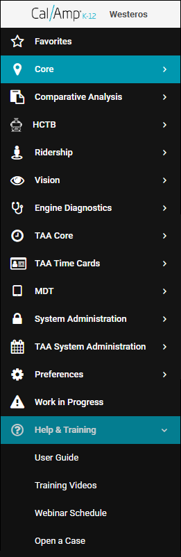 - From any CalAmp K-12 screen, click the Help & Training icon (