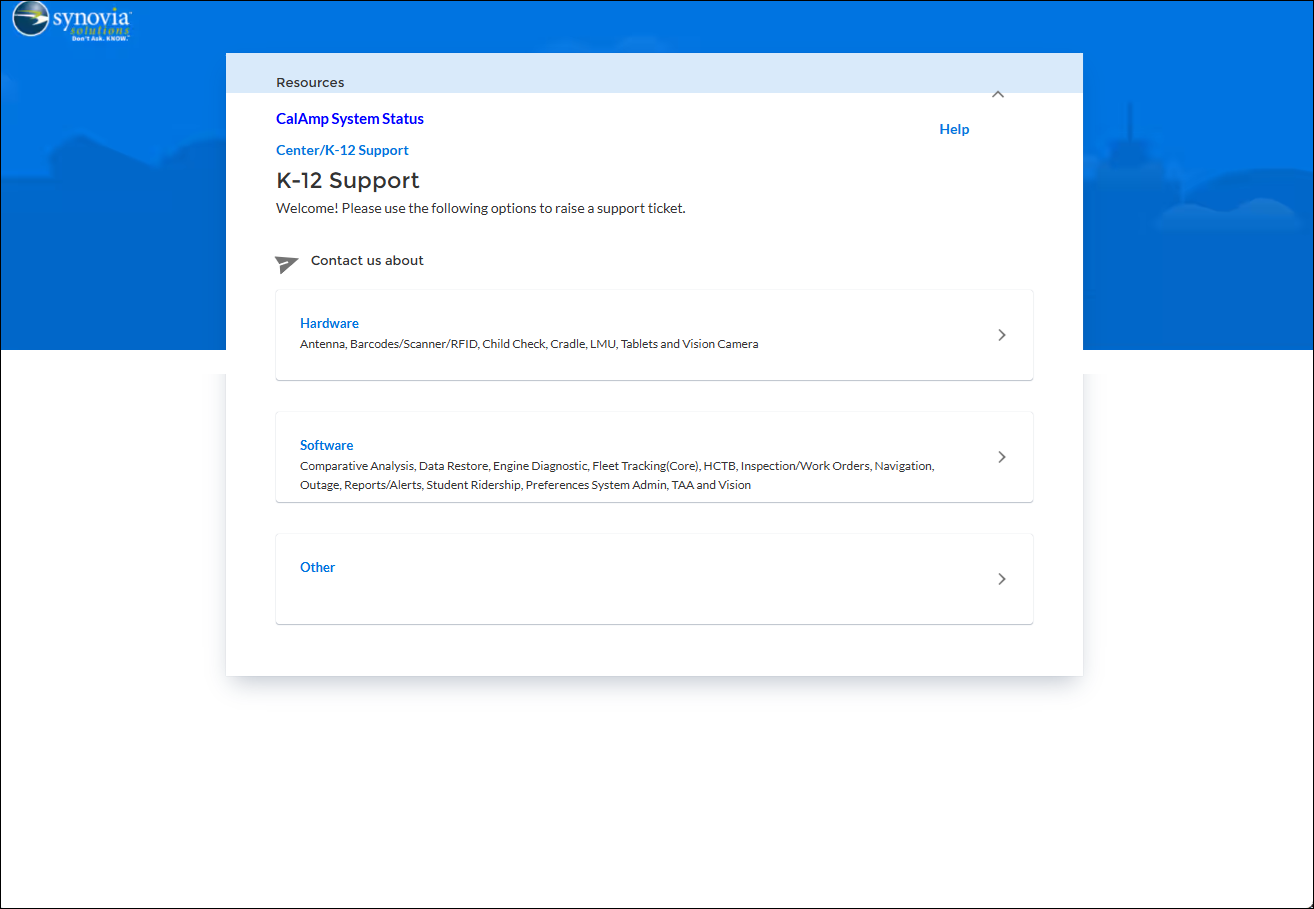 The CalAmp K-12 Support Help Center will open on a new tab.