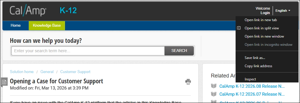 If you have an issue with the CalAmp K-12 platform that the articles in this Knowledge Base can't help you with, you can contact Customer Support by creating a case. The first section below shows you how to do so from within the CalAmp K-12 software. The second section demonstrates opening a case from within this Knowledge Base of help documents.
