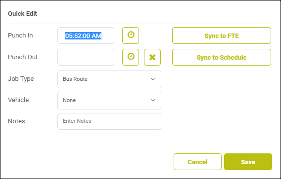 Note: This option will close out the dialog box for you as well, completing the procedure. - If your organization uses schedules, and this employee has one assigned, you can match the shift to the exact schedule hours by clicking Sync to Schedule.