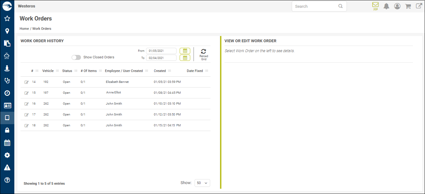 - If you'd like to see work orders that were previously closed (such as if a repair has been made and entered), select Show Closed Orders. (