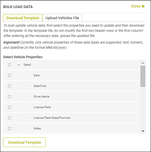 - On the System Administration >> Vehicles screen, expanded the capabilities of bulk loading updates to enable users to change most of the vehicle property types they have established, including custom ones. (Previously, only the basic properties such as vehicle name and VIN could be edited in bulk.) The new Bulk Load Data dialog box will list the available vehicle properties (from the Edit Vehicle screen); users select the check boxes of the ones they want to update in bulk; and those properties will be included in the template when it is downloaded. Note that properties with drop-down lists (the picklist datatype), Yes/No choices, or time values still cannot be modified in bulk.