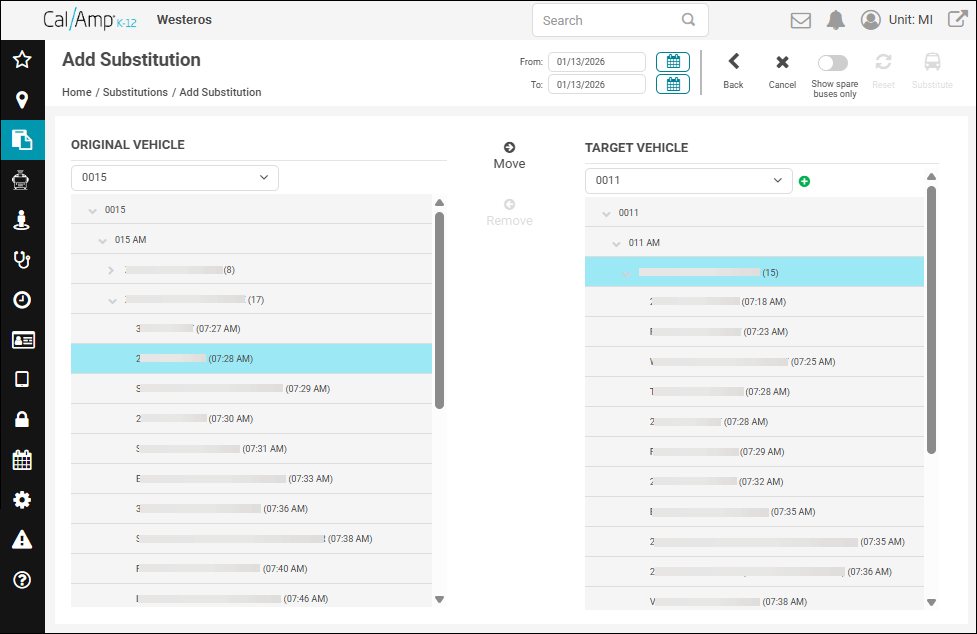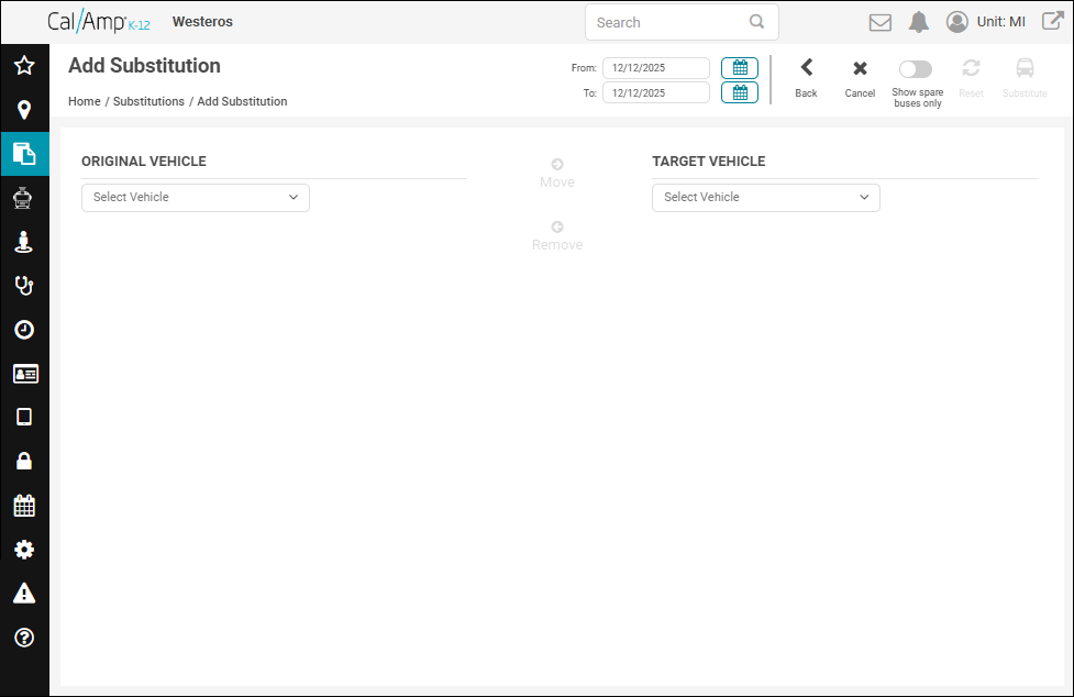 You can substitute vehicles in CalAmp K-12 on the Substitutions screen if the vehicles can't perform their usual routes. Making this substitution keeps the route data current, even though the vehicle has changed, and reports the replacement's route information to Here Comes the Bus, if you have that add-on app. (See the Here Comes the Bus website and the Here Comes the Bus Help documentation for more information.)