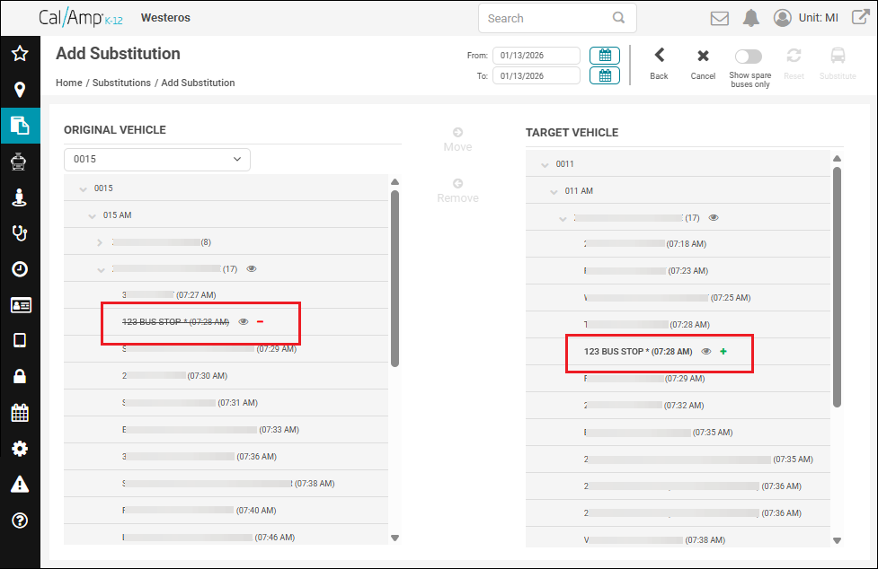 Note: Each stop will have the time of day it is expected to be made, so you can expand the substitute vehicle's route until you reach the correct period of the day. - In the original bus's itinerary, click the first route/tier/stop that needs a replacement vehicle.
