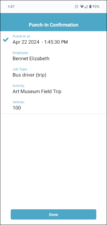The Punch-in Confirmation screen will appear again but will now include the name of the activity you are running.