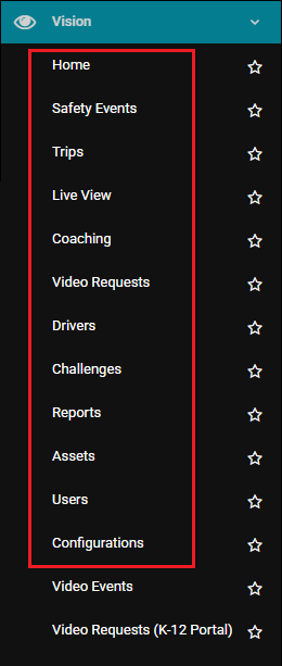Note: Just the menu options in the red square here are the Vision Portal. The final two are the standard CalAmp K-12 Vision screens. (See Viewing Available Videos and Video Requests for details about these.)
