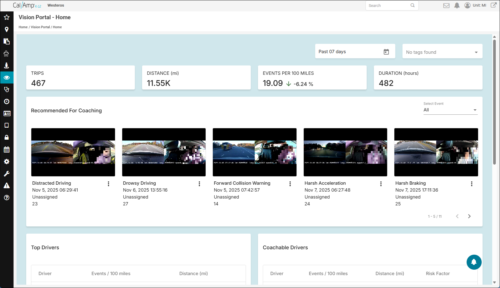 >> Home) shows an overview of your Vision data, including the number of trips for the selected time range, the distance traveled, which drivers have the best and worst records (the fewest and most Vision violations), and which drivers might need more training.