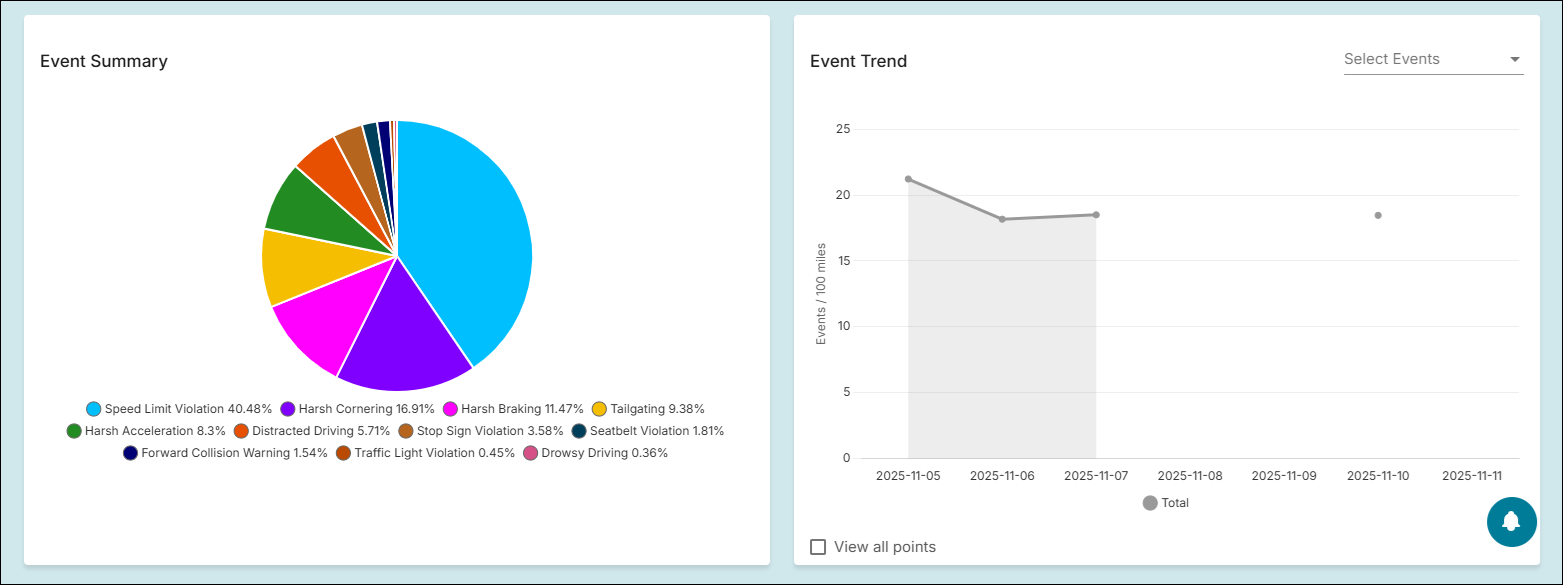 - Event Trend: A line graph showing the total number of events from day to day. You can click the Select Events drop-down arrow and choose just certain violations to be displayed.