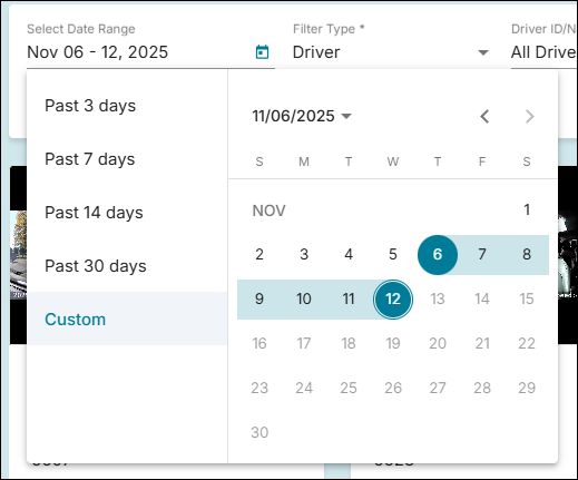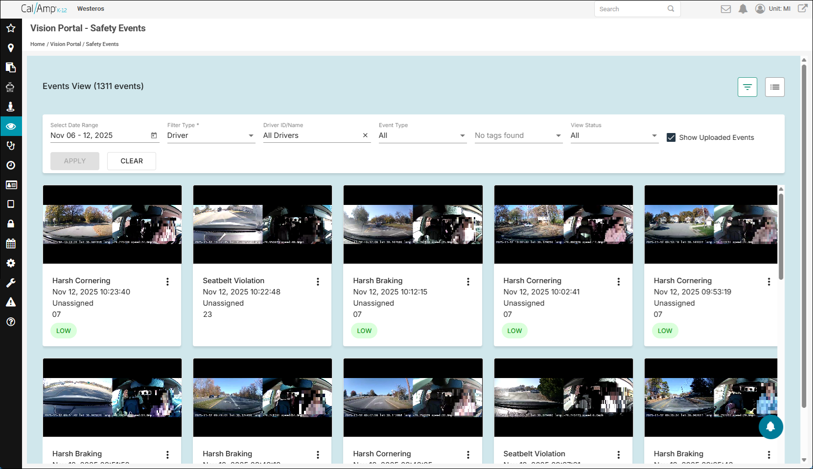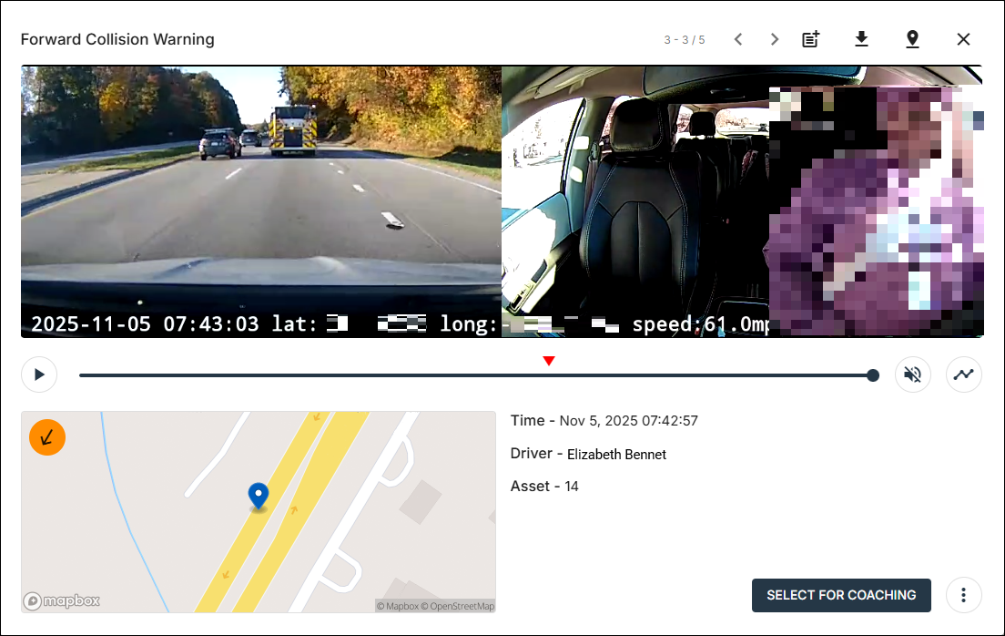 >> Safety Events, shows all the safety violation event videos for the selected time range, which by default is the last seven days (including the current day).