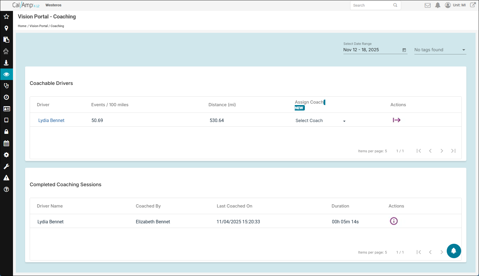 On the Vision Portal's Coaching screen, you can see which drivers have been recommended for coaching due to safety violations and track when they completed their training sessions as follows: