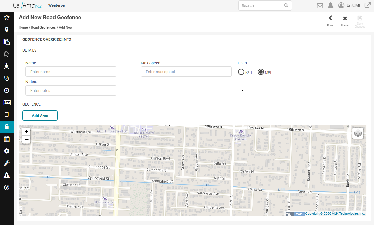 Note: You might want to add a prefix for the geofence name to indicate that this is only for correcting the speed limit, or you could simply use the address of the location. Just make sure that you don't use the same name as one of your actual locations. - In the Max Speed field, type the actual posted speed limit.