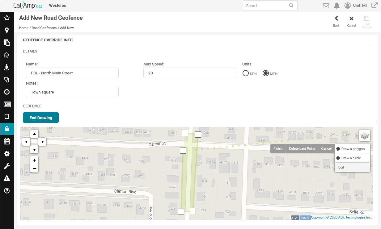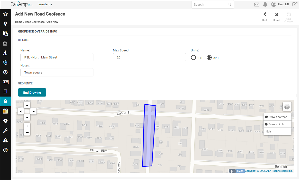 Note: Keep the geofence small — only to the part of the road that needs the PSL to be corrected.