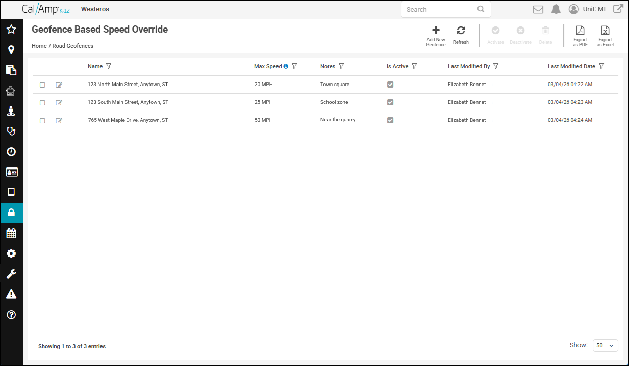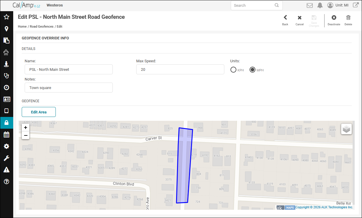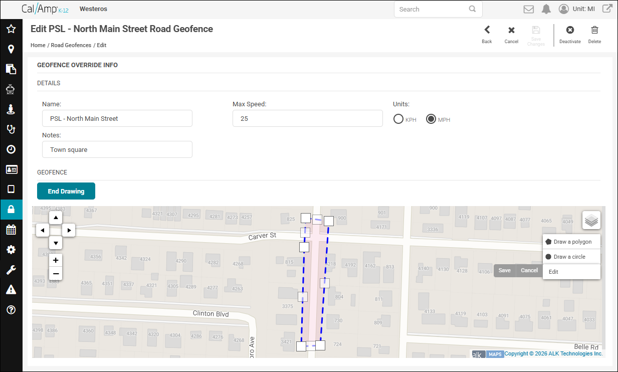 Note: To see how to add a new geofence to correct a posted speed limit in CalAmp K-12, go to Adding a Geofence to Correct a Road's Speed Limit.