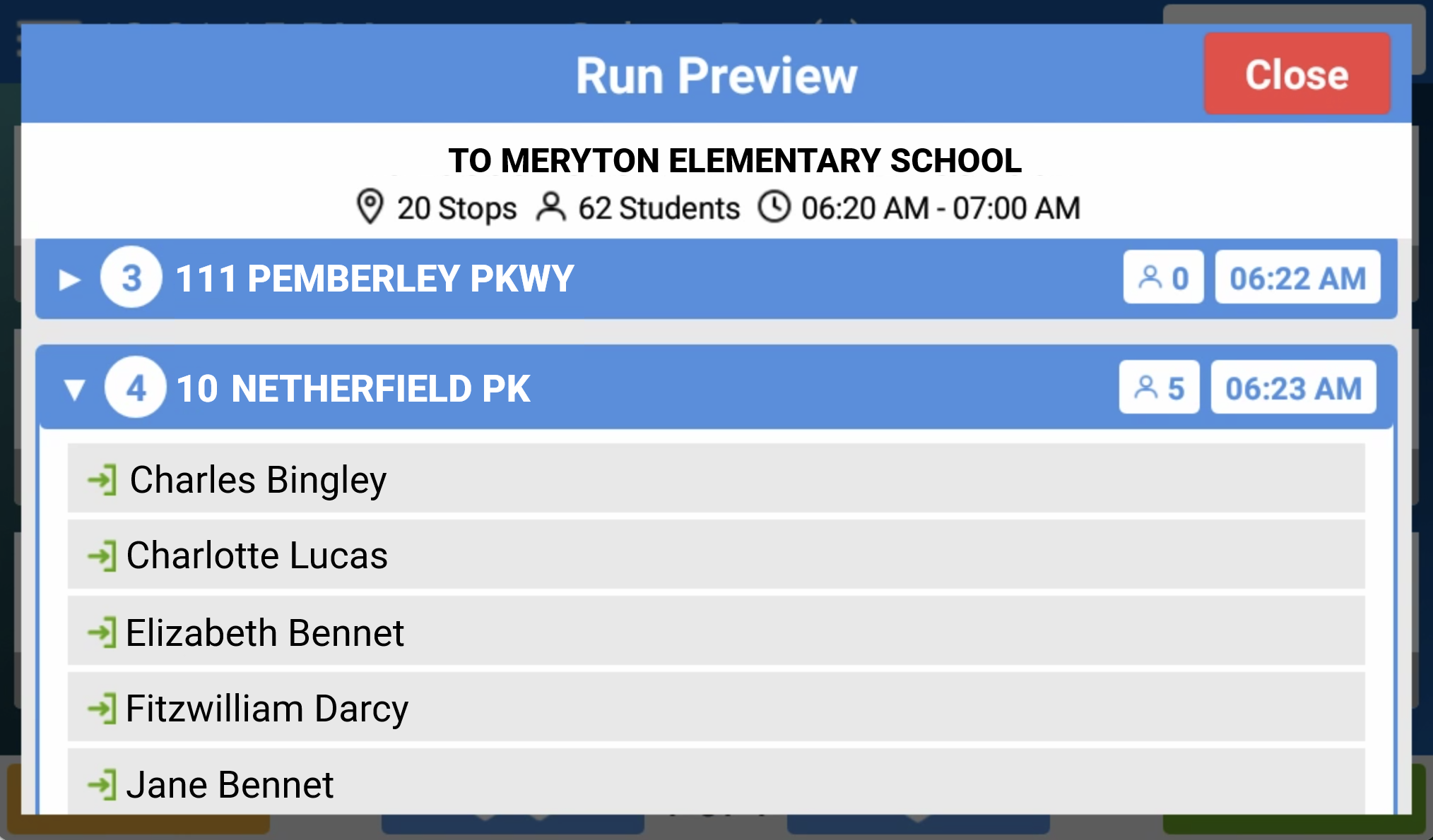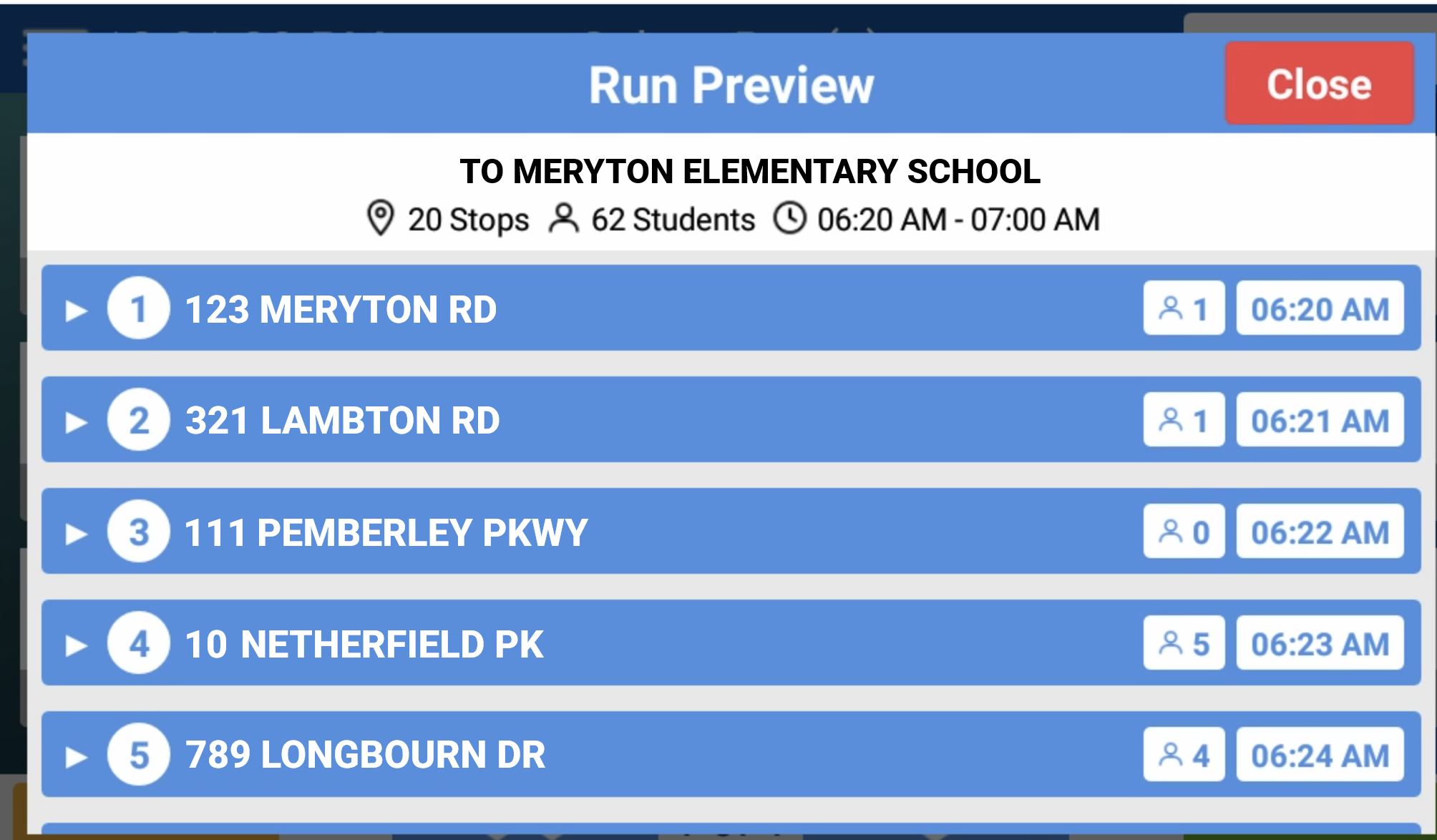 - Added a Run Preview screen, which will show a preview of the stops and students for a tier so that drivers can see what route they are picking up (in the case of a bus substitution) in advance. Drivers can launch this using the new Preview button on the Select Run(s) page and then tap a stop to see the students to pick up there.